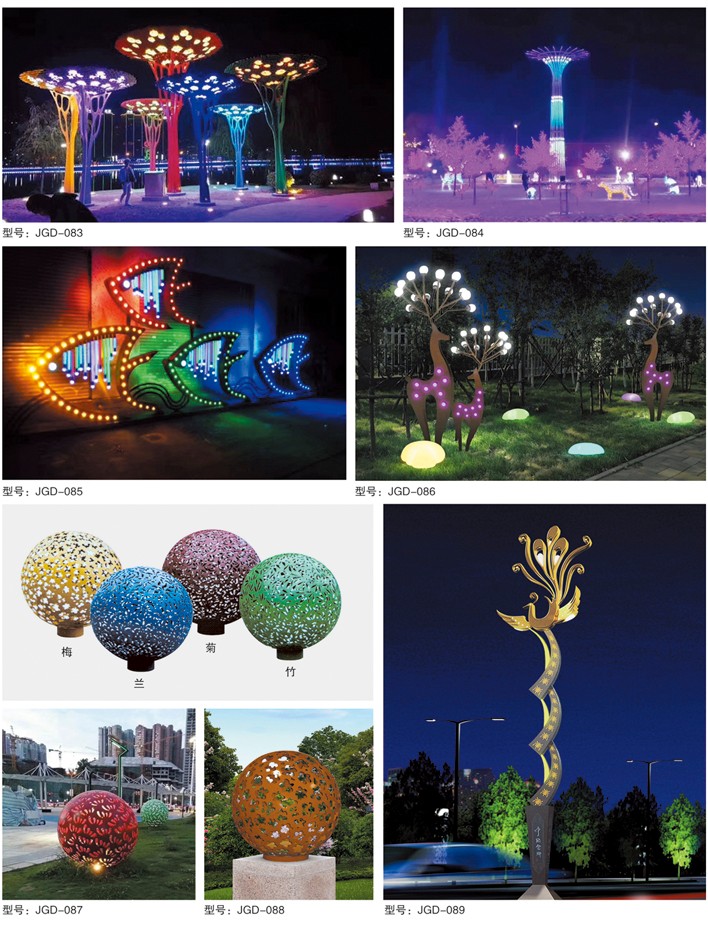 裝飾型景觀燈飾產品。設計風格或抽象前衛如藝術雕塑,或仿真寫實如自然常態。在展示現代精美制造工藝同時,又融入多種具有一定地方或民族文化特式的元素,即可美化亮化環境,又能成為- -座城市一個地區一方民族文化的象征。無論是大型文化廣場還是時尚建筑群落都有他適合的道理。極具觀賞和使用價值。